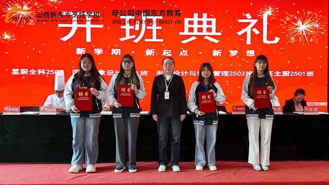 山西新东方职校迎来了25级秋季班的新同学们。今天,我们齐聚一堂,隆重举行开班典礼,共同见证中餐专业、形象设计专业的新生们,正式开启人生的崭新篇章。这里将是你们习得一技之长的沃土,是你们追逐职业梦想的起点,更是你们绽放青春光彩的舞台。