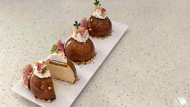 步入展台现场,数十款法式慕斯甜品错落陈列,瞬间让人仿佛置身巴黎街头的精致甜品店。镜头拉近,淋着镜面釉的慕斯蛋糕最为吸睛——深咖色的歌剧院慕斯泛着绸缎般的光泽,轻轻晃动便折射出细腻光影;淡粉色的草莓慕斯表面,新鲜草莓片与薄荷叶错落点缀,颜值与清新感兼备;还有融合了当下流行元素的低糖抹茶慕斯,浅绿底色搭配金色糖针,简约又高级。每一款作品都层次分明,切开后可见细腻的慕斯体、醇厚的夹心与酥脆的饼底,一口下去的丰富口感,藏着对