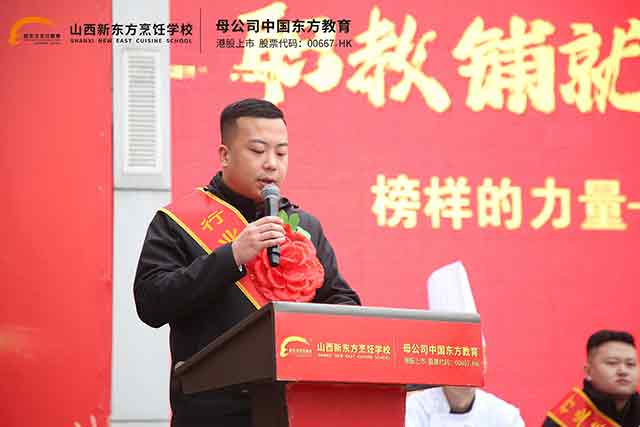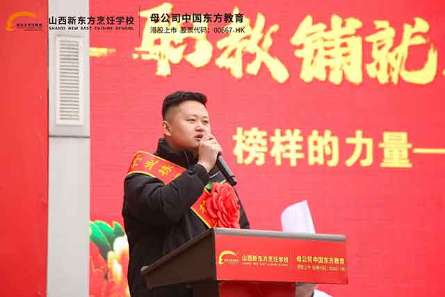 报告会尾声,山西新东方烹饪学校校长助理孟助作总结致辞。他指出,2026年是国家大力发展现代职业教育、加快建设技能型社会的关键之年,也是山西省深化产教融合、强化技能人才培养、全力推动高质量就业的重要一年。作为三晋大地职业教育的骨干力量,山西新东方将始终坚守立德树人、育训结合、就业为本的办学理念,持续优化专业布局、强化实训教学、深化校企合作,不断完善入学—培养—实习—就业—创业全链条育人服务体系,以更优质的教育教学、更贴心的成长服务、更广阔的发展平台,为每一位学子成才圆梦保驾护航,让大家真正实现学一技之长、拥一生保障、创一番事业。他勉励全体在校学子以优秀校友为榜样,坚定技能成才、技能报国的理想信念,勤学苦练、笃行不怠,练就过硬本领,锤炼品德修为,用匠心守护初心,用技能成就梦想,以一技之长书写人生出彩、未来闪光的青春篇章。