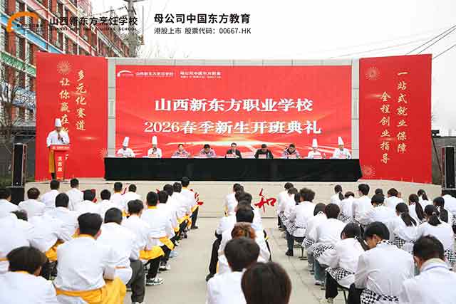 山西新东方职业学校隆重举行2026年春季班级开班典礼。中餐、西点西餐专业全体新生齐聚一堂,在庄重而热烈的仪式感中,正式开启技能成才新旅程。本次典礼围绕规范养成、教学提质、就业护航三大核心,生动展现新时代